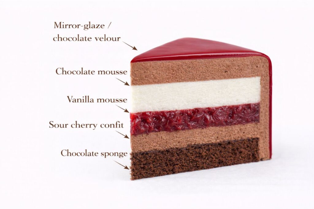 Elegant mousse cake made with layers of rich chocolate mousse, smooth vanilla mousse enriched with white chocolate, and a bright sour cherry confit set on a moist chocolate sponge base. Deep chocolate notes, delicate vanilla sweetness, and vibrant cherry acidity create a refined, well-balanced dessert perfect for celebrations and special occasions.